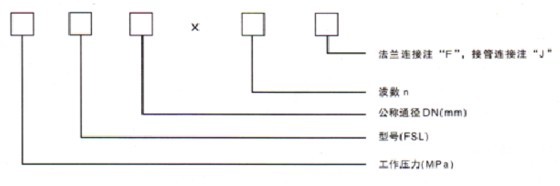 舉例:0.6TNY500TF 表示:公稱通徑為Φ500,工作壓力為0.6MPa,(6kg/cm2)波數為4個,帶導流筒,碳鋼法蘭連接的內壓式波紋補償器。
